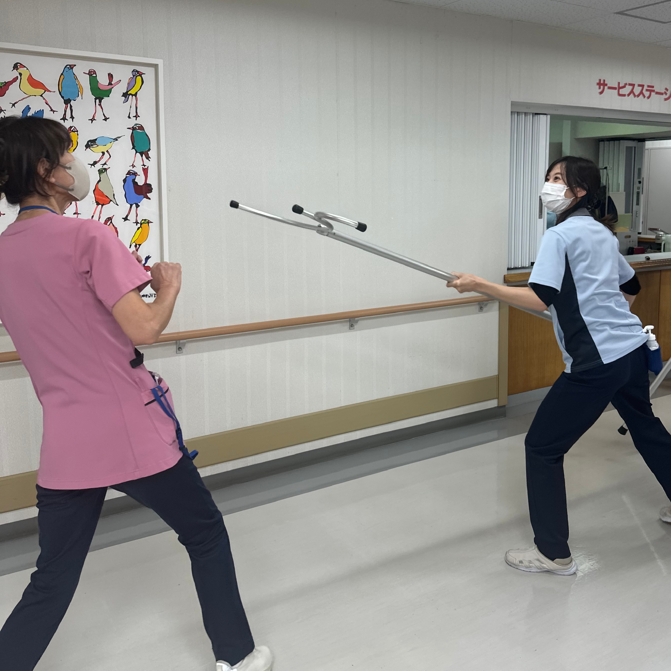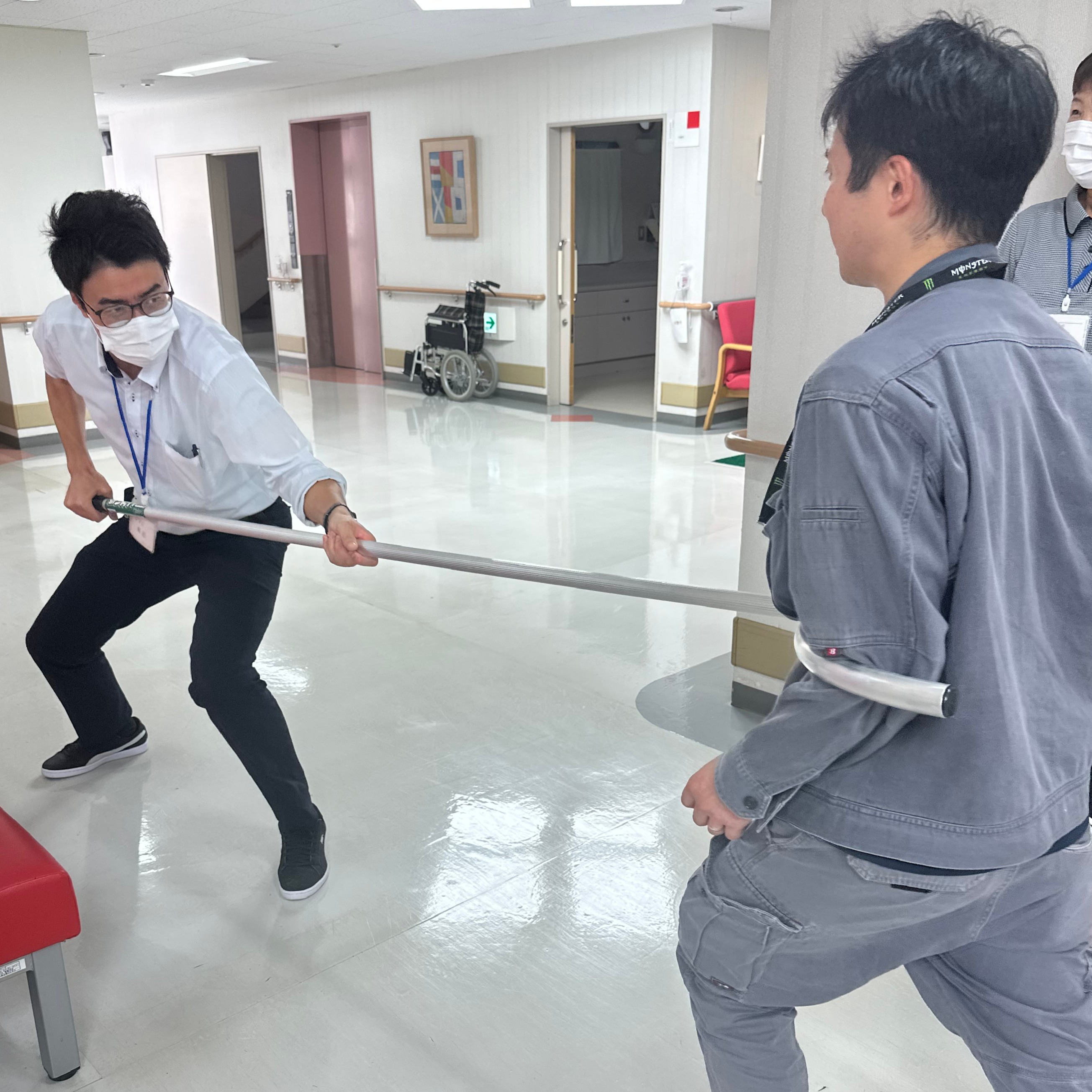 さすまたを持つことも初めての職員がほとんどでした。順番に実際に持ち、正しい使い方を職員全員で学びました。