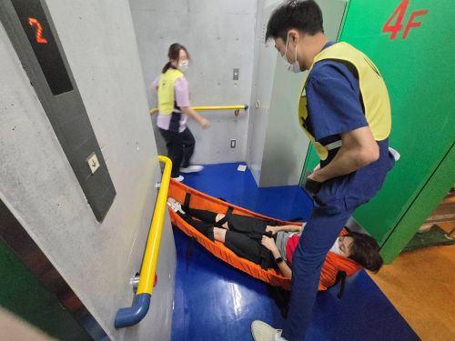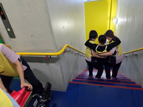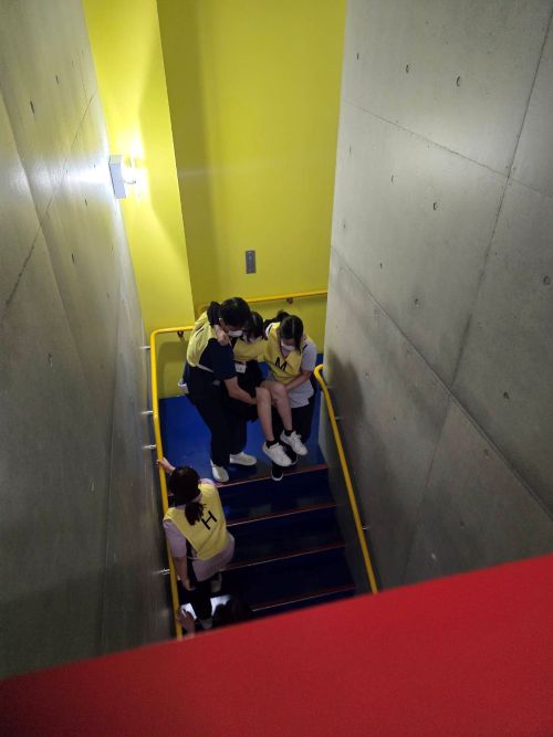 しっかりと患者(役)を抱えて安全に階下へ避難させます。